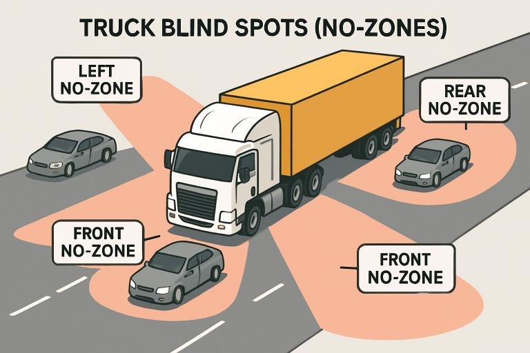 - Large trucks have persistent blind spots that smaller vehicles must avoid.